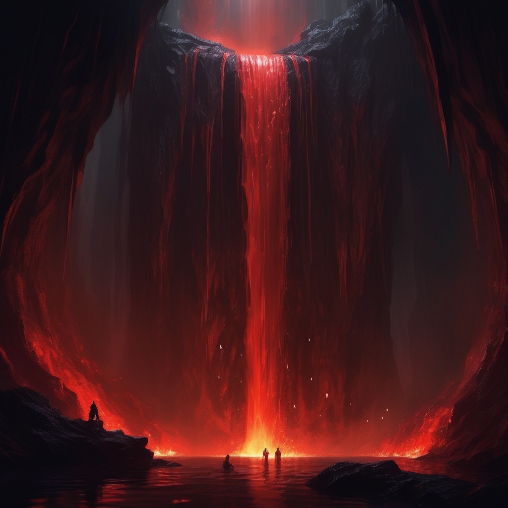 Dexter described this moment as one of pure horror. The sight of blood and fire blending together and crashing into the depths below made him feel as though he stood at the edge of Hell itself. It was as if every violent act committed by humanity had bled into this raging torrent, forming a river that flowed endlessly downward, dragging the accursed souls with it. The height of the waterfall seemed immeasurable—an endless drop into darkness, an eternal fall for those condemned to deeper torments.
